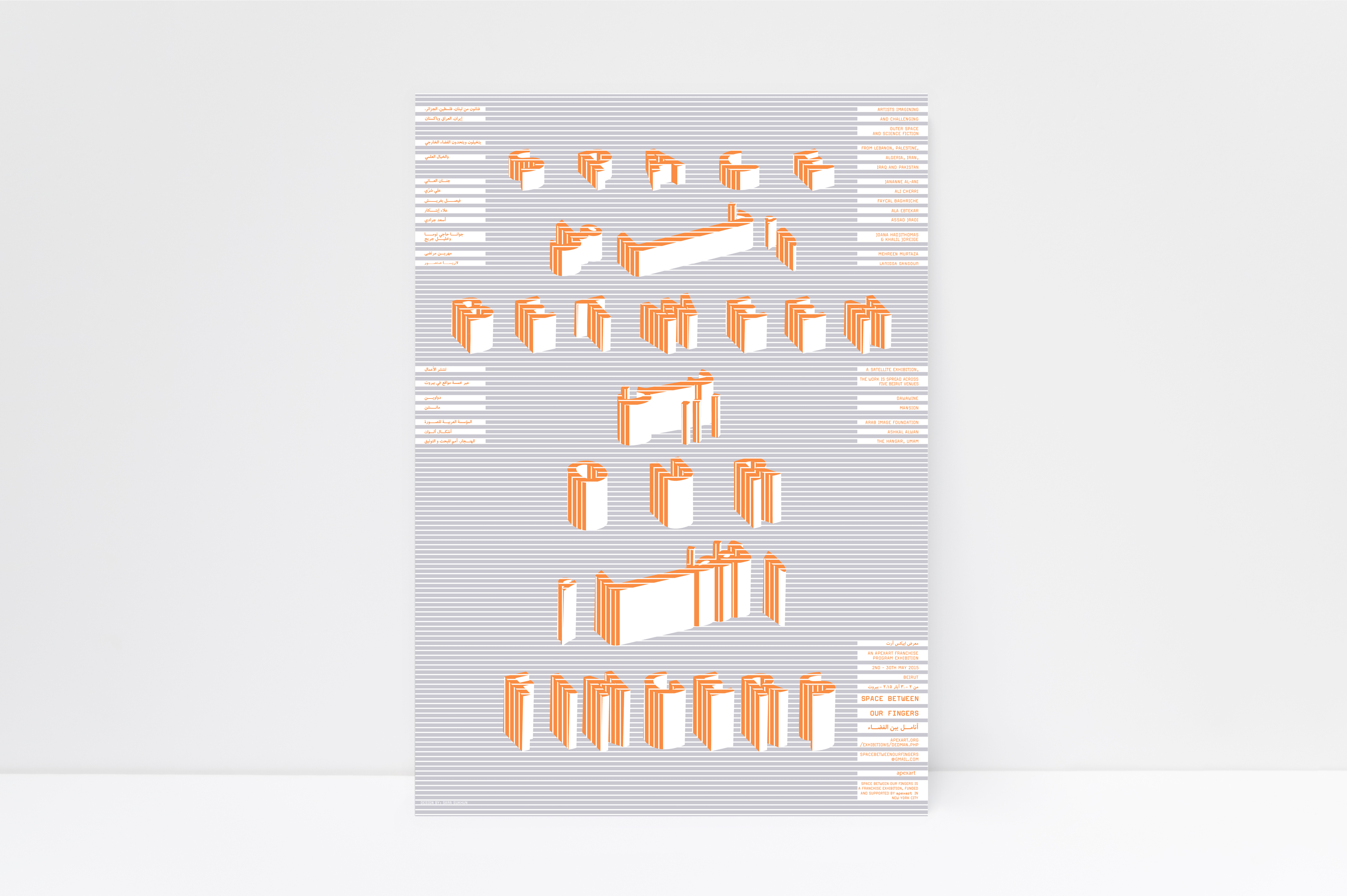 Space Between Our Fingers is an exhibition curated by Rachel Dedman for Apexart. Hosted across five different exhibition spaces in Beirut, it showcases the works of seven artists who engage with outer space and science fiction as they relate to political imaginaries.